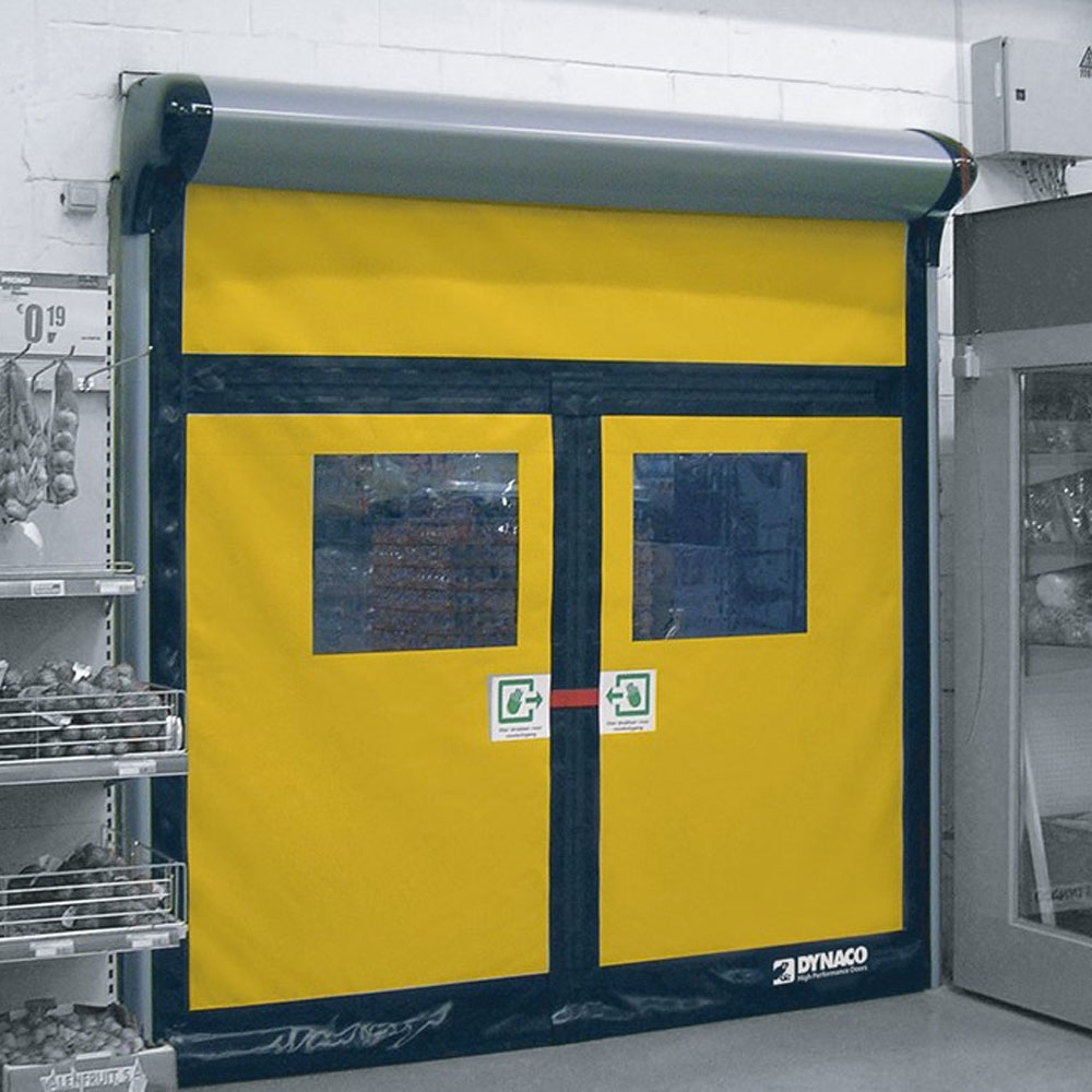 La Dynaco D-313 Emergency è stata concepita come uscita d’emergenza per applicazioni interne. Allo stesso tempo, offre i vantaggi di una porta rapida flessibile Dynaco. Con il design moderno è la porta più compatta sul mercato. È flessibile e richiede poca manutenzione. Una porta ideale per la grande distribuzione. Un taglio a forma “T” divide il telo in due pezzi. Premendo sul punto indicato dalla segnaletica, si crea una vera uscita d’emergenza.